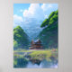 En esta obra de arte digital, un pequeño y tranquilo templo japonés está rodeado por un bonito bosque verde sobre un lecho de río. Las tranquilas aguas del tranquilo río reflejan el cielo y la exquisita forma del templo a medida que pasan. El torbellino de hojas y el parloteo de aves llenan el bosque que rodea el santuario.