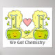Dos preciosos frascos de química feliz con líquido verde burbujeando la parte superior con cara sonriente feliz y un corazón de amor rosado entre ellos. Debajo están las palabras que obtuvimos química con letras grises.