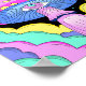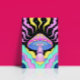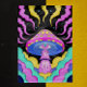 Esta vibrante imagen representa un hongo altamente estilizado y psicodélico como su foco central. El hongo tiene una gorra rosa brillante con manchas amarillas y un diseño prominente de "tercer ojo" en el centro de su costado azul. Unas nubes turquesa, rosas, amarillas y turquesas, nadan en un fondo oscuro salpicado de pequeñas estrellas brillantes. La estética general es caprichosa, mística y profundamente reminiscente del arte psicodélico.