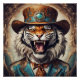 Un tigre caprichoso llamado Terence vistiendo un gorra, corbata y rugiendo.