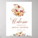 Celebre a la novia con esta elegante invitación de boda de 'Enamórate en Otoño', que presenta calabazas blancas, flores de color naranja quemado y terracota, hierba de pampas, flores de marsala y granos de trigo. Una hermosa mezcla de encanto rústico y botánicos de moda de otoño, perfecta para eventos de campo o con temática de cosecha. Fácilmente personalizable para su celebración de otoño.