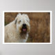 Fotografía de un terrorífico de Wheaten sobre cubierta suave parado en la hierba de otoño.