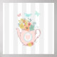 Un poster con un ilustracion caprichoso. Una tetera rosa con un pequeño corazón rosado en el centro y un ramo de flores en el interior. Delicadas mariposas de colores pastel revolotean por todas partes. Sobre un fondo rayado gris y blanco.