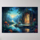 A radiant temple glows softly beside a tranquil river, nestled within a lush and dreamlike landscape of towering bamboo and vibrant blooms. Warm golden light spills from its ornate doorway, reflecting across still waters and guiding the eye toward distant mountains beneath a rising sun. The scene evokes a sense of quiet wonder and sacred calm, where nature and architecture meet in a peaceful, otherworldly sanctuary.