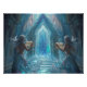 Scrolls in hand, they stand as keepers of ancient lore, bathed in radiant blue and turquoise light.