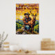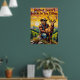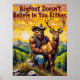 Esta reconfortante obra de arte captura a Bigfoot, un verdadero "guardián del valle", que llevaba un gorra y overoles de vaquero, sentado en una roca y abrazando suavemente a un venado pequeño. El escenario se encuentra en un pintoresco valle con una colorida puesta de sol y colinas onduladas. El emblema icónico con las memorables palabras "BIGFOOT TAMPOCO CREE EN TI" se muestra de forma destacada. Los gruesos trazos texturados de la pintura contribuyen a la calidad encantadora y caprichosa de la imagen.