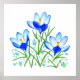 A print with three vibrant blue crocuses depicted with delicate green leaves. Their gentle petals and bright centers capture a fresh spring essence. Original artwork by W.B.