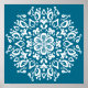 Esta mandala blanca se sienta sobre un fondo verde azulado. Los colores son muy tranquilos y relajantes. Parte de la colección Pras Mandala.