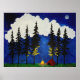 Impresión de una pintura acrílica hecha por Jeremy Bonsol. Tienda roja y escena de fuego en el campamento iluminando los árboles de silueta en primer plano. Estrellas y nubes llenan el fondo para crear una escena nocturna pacífica de camping en el bosque.