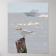 "Royal Tern in Florida" de Catherine Sherman. Un Royal Tern aparece en un post en Fort Myers Beach, Florida. Un barco pesquero atraviesa el surf de fondo.