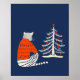 Ilustracion lindo de un tigre vestido con un suéter rojo esperando Navidades frente al árbol.