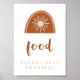 Este cartel de la mesa de comida imprimible incluye un arcoiris de terracota naranja quemado por bohemias con un sol en el centro y una tipografía escrita a mano. Edite la mayoría de las palabras para satisfacer las necesidades de su evento. ¡💜 COLORES SON EDITABLES! Haga clic en 'editar diseño' para cambiar los colores de su fiesta.