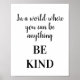 Moderno Poster de Tipografía Motivacional en blanco y negro BE AMABLEMENTE Inspirador. Excelente cita "En un mundo donde puedes ser cualquier cosa amable". Se muestra en texto negro sobre blanco. Todo el texto, color de texto, es personalizable.