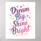 Dejen que sus ambiciones destaquen con esta cita edificante de "Sueño Grande, Brillante Brillante". Escrito en una hermosa mezcla de escritura y fuentes modernas y adornado con estrellas brillantes y coloridas, este diseño es un deslumbrante recordatorio para perseguir sus sueños y dejar que su luz interior brille. Es perfecto para cualquiera que necesite un poco de motivación y magia.