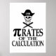 Un cráneo con un diente de oro y un parche en el ojo que lleva un gorra pirata con dos plumas formando una "X" debajo de él en lugar de los huesos cruzados típicos. En el gorra está el número de "Pi" redondeado a cinco números. Debajo del cráneo y cruzado está la frase "Pi-rates of the Calculation" Las letras "Pi" en la palabra Pi-rates han sido reemplazadas por el símbolo para Pi.