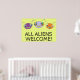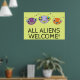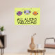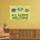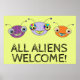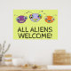 Un poster divertido y colorido con el diseño de tres lindas cabezas alienígenas y el dicho '¡TODOS LOS EXTRANJEROS BIENVENIDOS!' ¡Su sonrisa 'toothy' es absolutamente contagiosa!