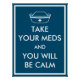 Una parodia del popular tema "MANTENER CALMA Y SEGUIR". Una gorra de enfermera reemplaza a la corona familiar acompañada de texto que dice: "TOME SUS MEDIOS Y USTED SERÁ TRANQUILO". Haz lo que la amable enfermera te dice que hagas. Puede elegir otro color de fondo.