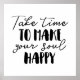 Tómate tiempo para hacer que tu alma sea feliz, Inspiradora cita en blanco y negro diciendo que la tipografía es *Personalizar! ¡Elige tu propio color de fondo impreso!