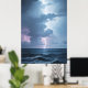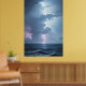 Una dramática pintura digital representa un paisaje marino tormentoso con un potente rayo que golpea el océano. El cielo está dominado por nubes oscuras y agitadas, con un toque rosa a lo lejos. El rayo es un blanco brillante que ilumina las nubes y las ondas agitadas que hay debajo.