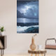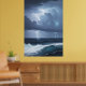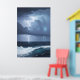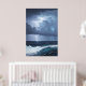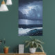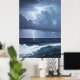 Una dramática pintura digital representa una tormenta con un cielo oscuro y abrasador lleno de espesas nubes grises. Varios relámpagos brillantes se extienden a través de las nubes, iluminando la escena con una luz blanca y cruda. El océano que hay debajo es de un azul oscuro y profundo, con olas de capuchas blancas que se estrellan contra la orilla.
