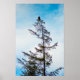 Una fotografía de un águila calva americana posada en lo alto de un pino alto. Un cielo azul con nubes brumosas está en el fondo. Se pueden encontrar rastros de luz solar y nieve en el árbol y sus ramas.