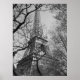 Captura ascendente de la Torre Eiffel a través de un marco de ramas de árboles.