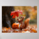 Esta adorable imagen muestra una ardilla roja parada erguida bajo la lluvia, sosteniendo una gran hoja de otoño como un paraguas encima de su cabeza. Cerca hay una calabaza tallada que añade un ambiente festivo de otoño. La foto capta un momento encantador e inesperado en la naturaleza.