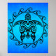Diseño de tortuga al estilo tatuado de la tribu polinesia negra en el centro de un símbolo solar maorí con fondo azul océano.