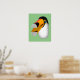 Un tucán gracioso, sonriente, personalizado con un pico que parece una lata de soda (¡incluso tiene algo de soda!), y un cuerpo en forma de frijol sin alas ni piernas.