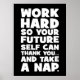 "Trabaja Duro Para Que Tu Futuro Pueda Agradecerte... Y Take A Nap" es una declaración motivacional para soñadores, estafadores y triunfadores que entienden el valor de poner en el esfuerzo ahora por recompensas más adelante. Este diseño humorístico e inspirador es ideal para las personas que luchan por el crecimiento personal, el éxito profesional o metas ambiciosas. Ya sea que estés atravesando un día duro o que te mantengas comprometido con tu visión, este mensaje sirve como un recordatorio diario de que cada esfuerzo hoy construye un mejor mañana. Excelente para emprendedores, estudiantes y cualquiera con un implacable impulso para tener éxito.
