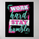 Estilo retro colorido, motivación gruesa "Trabajar duro permanecer humilde" diseño de texto en colores rosa, azul y blanco
