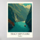 Witness the dramatic beauty of Tracy Arm Fjord, Alaska, with this stunning vintage travel design. Featuring towering cliffs, a cascading waterfall, and a boat navigating the pristine waters.