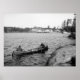 Vieja foto de cazadores con ciervo en la canoa. El Paul Smith's Hotel, Adirondack Mountains está al fondo, 1903.