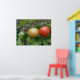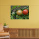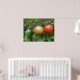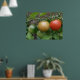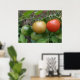 This beautiful poster features a photograph of a bunch of ripening tomatoes including a red, orange and green cherry tomato in a line, growing on a tomato plant in a suburban garden. The photograph was taken using macro photography for a detailed result.