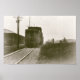 Sepia-toned distressed 1983 train on railroad tracks on a 8" x 12" Archival Heavyweight Paper (Matte).