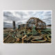 Fotografía de trampas o ollas de langosta, con cuerdas coloridas apiladas a su lado en una playa contra un cielo nublado.