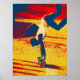 Un atrevido joven muestra un truco con su patineta en un parque de patinaje local durante una demostración de patinaje sobre patinaje libre. Obra de arte de estilo ondulado en tonos rojos y amarillos profundos con un efecto silueta, derivada de una fotografía original. Esta es la elección perfecta para los amantes del patinaje extremo.