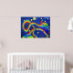 Un arcoíris colorido sale del globo y desaparece en el espacio azul, transformándose en espacios y estrellas.