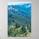 A photograph of a section of the Olympic Mountain range and a pine forest surrounding the ridge line of the Olympic National Park region.