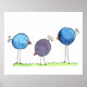 Divertida pintura acuarela de tres pájaros brillantes en azul y púrpura con largas piernas delgadas sobre hierba verde.
