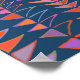 Un divertido patrón geométrico pintado de triángulos en profundos y ricos tonos azules emparejados con un arcoiris de color.