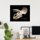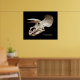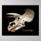 Fossilizado Triceratops cráneo en silueta sobre un poster negro.