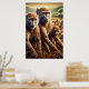 Tres monos enérgicos cavan alegremente en un exuberante campo verde, sus animadas payasadas capturadas en una vibrante pintura rebosando de color y movimiento.