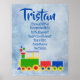 Tristan Name Poster on blue watercolor background, with a colorful toy train and customizable text. The adjectives start with each letter of the chosen name. You can customize the adjectives for this name or choose another name and corresponding adjectives. Or you can contact me to customize a poster with your name of choice. NOTE: when customizing, the top name is written twice (once in blue and once with a lighter "shadow") to make it stand out.