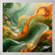 Vibrante esmeralda verde y ámbar dorado fundido fluyen juntos en olas lujosas y fluidas en este impresionante diseño abstracto. Los remolinos brillantes y translúcidos crean una sensación hipnótica de movimiento y profundidad, bellamente enmarcados por exuberantes hojas tropicales y delicadas flores rosa-naranja. Este patrón exótico y de alta energía irradia calidez, vitalidad y elegancia tropical moderna.