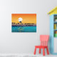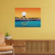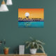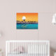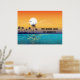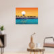 Tropical sunset, palm trees, ocean poster print, featuring an idyllic tropical scenery landscape of the setting sun, palm trees, birds the sea with reflections and birds. The sky is in red orange tones and the horizon in purple grey. It is a template and you can add your text, a quote, a poem or delete it.