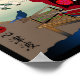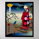 Esta impresionante obra de arte japonesa estilo bloque de madera presenta un toque moderno al arte tradicional ukiyo-e, con un gato siamés vestido con un lujoso kimono rojo decorado con vibrantes patrones florales rosas y blancas en un fondo hexagonal negro. El gato está contemplativamente parado en una veranda de madera (engawa), mirando a un distante Monte Fuji bajo una luna llena. La escena captura un momento sereno con elementos tradicionales japoneses: pinos con agujas esmeraldas, nubes estilizadas y un pájaro azul (posiblemente un minah) encaramado en el pasamanos. Al fondo, una mesita acoge lo que parece ser un cuenco decorado con un patrón ondulado (波), añadiendo a la estética japonesa. La composición incluye elementos clásicos ukiyo-e como el cartucho amarillo en forma de ventilador en la parte superior izquierda que contiene caracteres japoneses, y un sello circular rojo con kanji en la parte inferior izquierda. El arte combina con maestría la elegancia refinada del arte tradicional japonés con el capricho contemporáneo a través de su protagonista felino. La paleta de colores es particularmente llamativa, con rojos profundos y negros del kimono que contrastan maravillosamente con el degradado sutil del cielo y el verde exuberante de las agujas de pino. El conjunto crea una armoniosa mezcla de arte clásico japonés y modernidad, lo que lo convierte en una pieza sofisticada para espacios interiores tradicionales y contemporáneos. El artículo mantiene con éxito el equilibrio, la composición y la atención a los detalles característicos de las impresiones de ukiyo-e, al tiempo que presenta elementos contemporáneos y juguetones que lo hacen único atractivo para el público moderno.