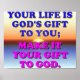 TU VIDA ES EL REGALO DE DIOS PARA TÚ. HACERLO TU REGALO PARA DIOS. Esta colorida imagen es una fuente de gran inspiración y aliento para todos los cristianos creyentes de Dios. Simplemente dice que así como Dios nos ha dado el don de la vida, deberíamos vivir nuestras vidas por él. Porque después de todo, ¡Él es el único que puede crear vida! ¡Pida hoy su copia del poster con una hermosa imagen!