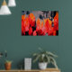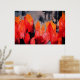 This expressive abstract artwork captures the dramatic beauty of a tulip field through bold shapes, rich texture, and intense color. Layers of fiery red, coral, and warm orange tulip forms rise from the lower part of the composition, contrasting strongly with the cool, moody grays and dark tones above. The thick, palette-knife texture gives the flowers a sculptural presence, making the scene feel vivid, tactile, and emotionally charged.