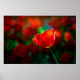 Flor de tulipán rojo brillante con fondo verde oscuro y manchas borrosas rojas de otras flores de tulipán. El símbolo de la nueva vida. Brilla, ilumina, irradia e inspira! Fotografía texturizada.